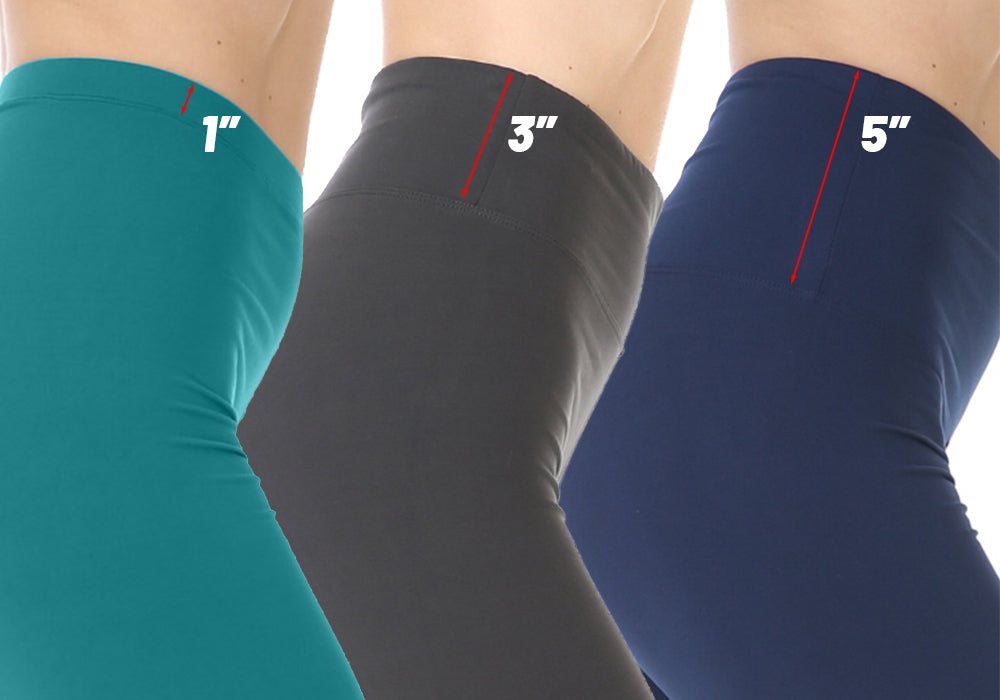 We have 3 different waistband options to fit your needs. Our classic 1" Waistband has a 1" elastic band that will keep your leggings securely in place while being very comfortable. Our 3" Yoga Style Band and 5" Yoga Wide Band have a 1/4" elastic on top of the waistband to keep your leggings in place and provide extra comfort during activities.